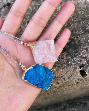 Blue and rose quartz crystal necklace